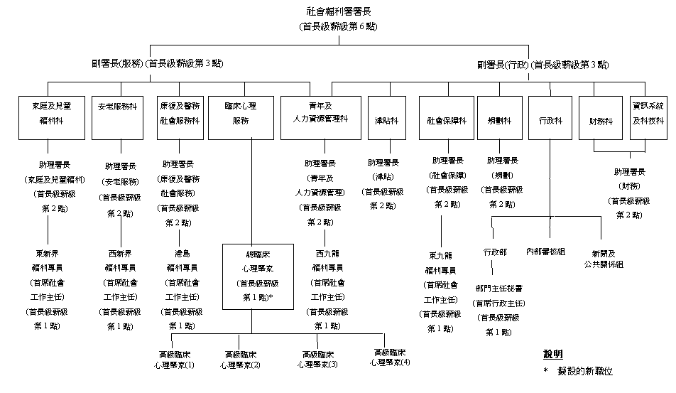 第1點的級別,藉此加強社署首長級架構。出任人員負責主管臨床心理服務。