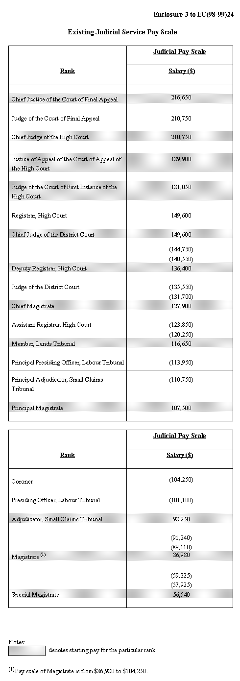 11. To facilitate reference to the pay of Judges and Judicial Officers, the Judiciary proposes to designate specific pay points to the Judicial Service Pay Scale. In designing the scale, we have made reference to the other pay scales used in the civil service, such as the Police Pay Scale. All pay points on the Police Pay Scale which fall within the range of the Master Pay Scale have designated pay points. For those pay points which fall within the range of the Directorate Pay Scale, the minimum and the increments (shown in brackets) for a particular pay point are taken together and regarded as one single pay point. The Judiciaryproposes to follow the same numbering system in designating the pay points on the Judicial Service Pay Scale. We set out at Enclosure 4 the proposed Judicial Service Pay Scale which takes into account the proposed revision in the pay scale of the Special Magistrate grade.