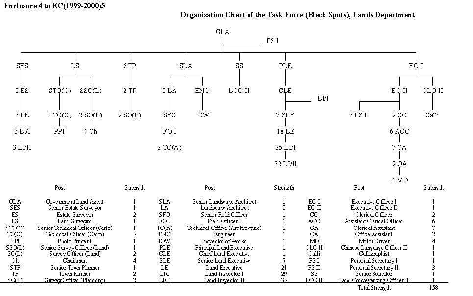 | 11.To provide professional and secretarial support to the TFB, we will retain the existing 157 non-directorate posts. The job descriptions of the GLA, departmentally known as Assistant Director/Task Force (Black Spots) (the AD/TFB), and the organisation chart of the TFB are at Enclosures 3 and 4 respectively. | Encls. 3&4 |