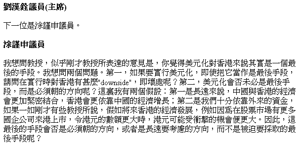 14. Regarding the appropriateness of maintaining the LER system for Hong Kong in the long run, Professor TSANG was of the view that whilst the benefits or otherwise of a fixed exchange rate or a variable exchange rate system was an issue subject to further debate, it was not opportune to abolish the US dollar peg at the moment. However, there might be growing doubts about the appropriateness of the fixed exchange rate of 7.80 in a possibly deteriorating external economic environment. In the long run, the issue might be considered in the next century if there was appreciation pressure on the Hong Kong dollar.