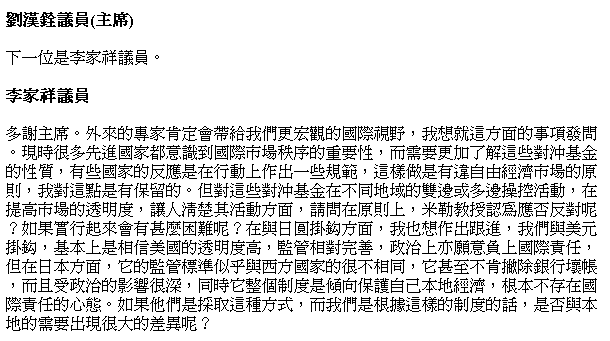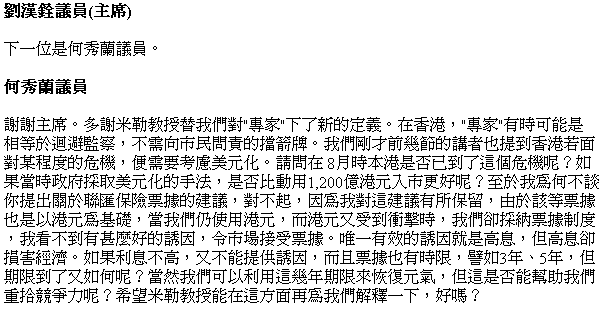 Thank you, Chairman, Prof Miller has been very critical of the government's intervention in the stock market in August and said that it has tarnished Hong Kong's free market image. But of course, events subsequently silenced some people because they looked at the fact that the stock market rose and we had made a profit, at least on paper, and they talked about the Federal Reserve bail-out of Long Term Capital Management, and said that there are all these problems in other countries as well.
