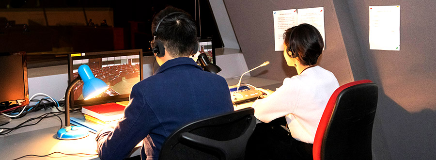 即时传译员在立法会会议期间,即场提供粤语丶英语及普通话传译。