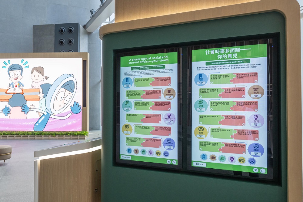 Visitors' Sharing Area is specially designed for visitors to cast their votes to indicate the area of social issues they are most concerned about, while live voting results will be displayed on the screen.