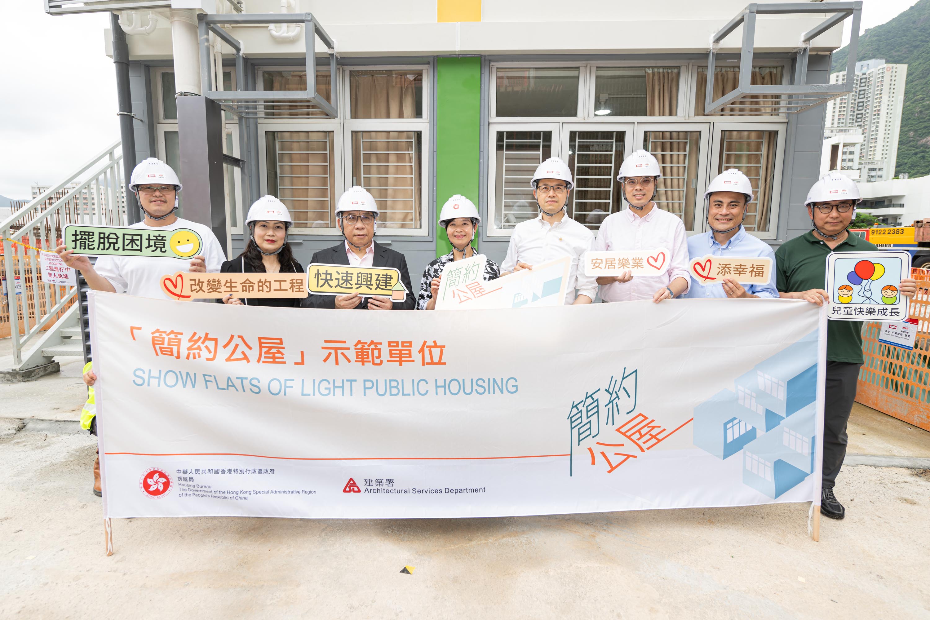 议员在房屋局局长何永贤女士(左一)陪同下,参观重用组装合成组件的示范单位