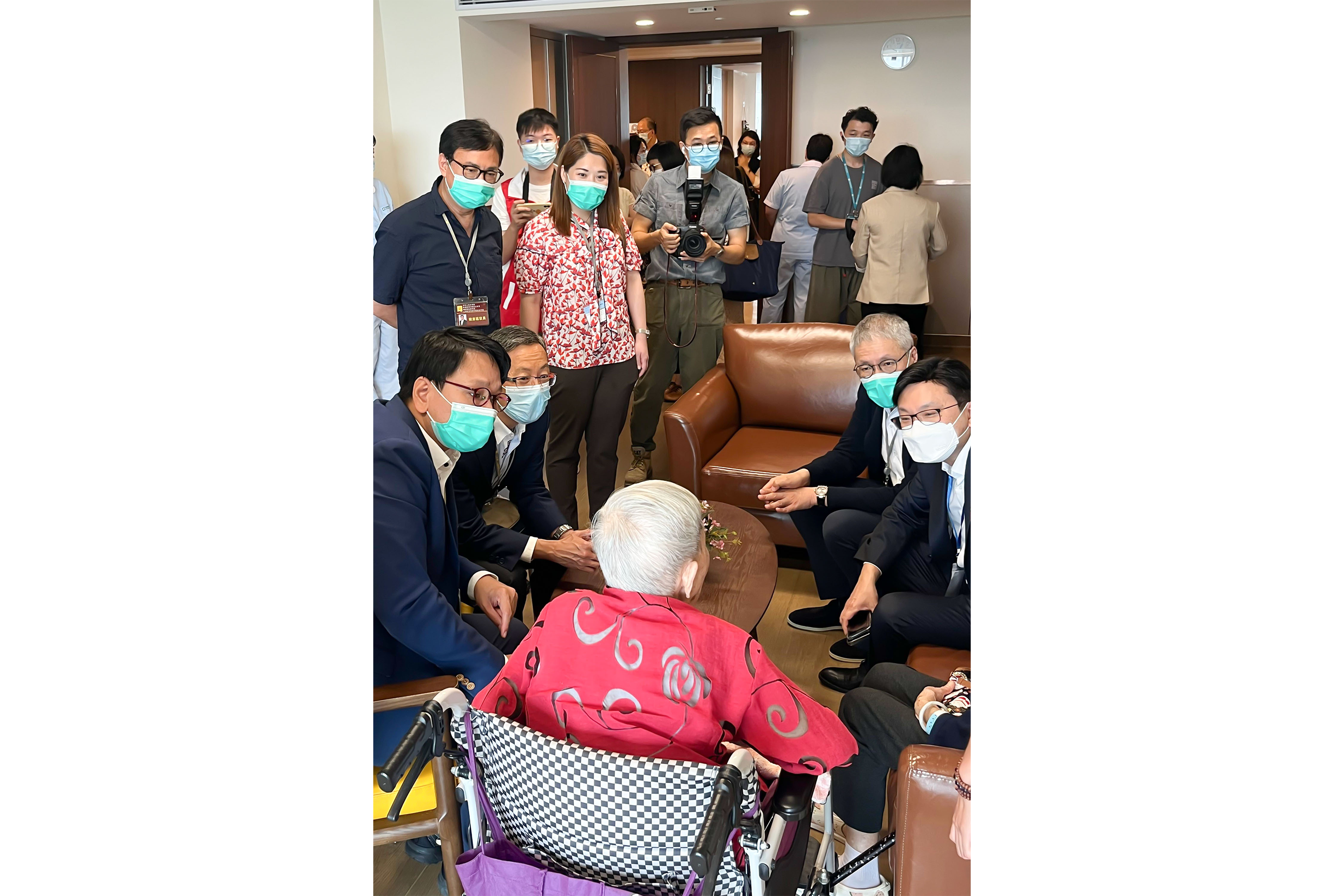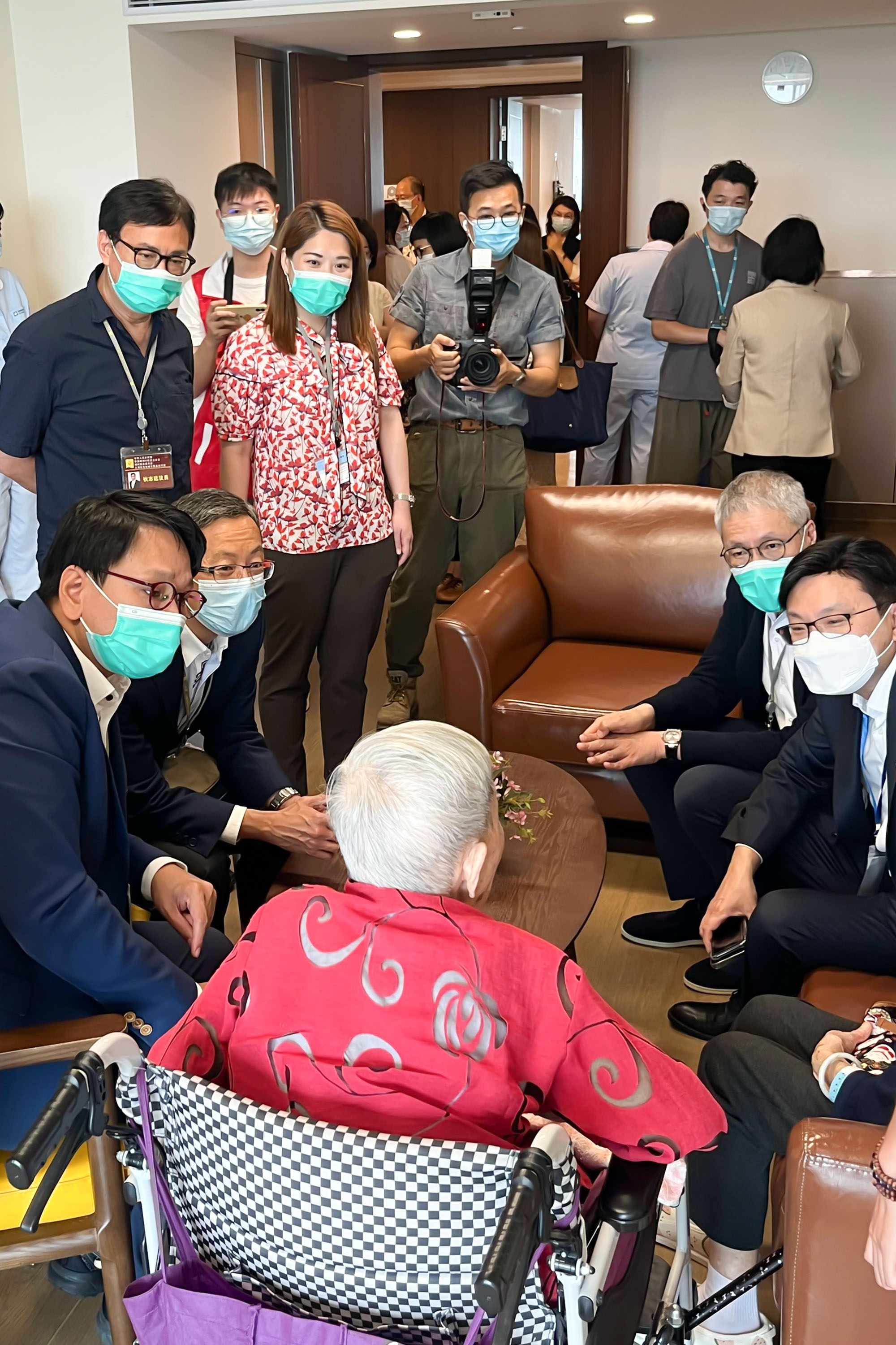 Members of the delegation of the Panel on Welfare Services and Mr Chris SUN Yuk-han (first from right), Secretary for Labour and Welfare, interact with retired Hong Kong elderly living in the Elderly Care Centre in Clifford Hospital to learn about their lives in the Mainland