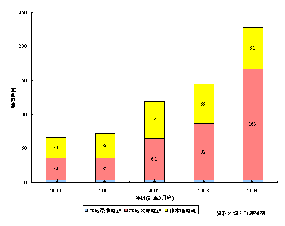 截 至 2004 年 8 月 , 本 地 免 费 、 本 地 收 费 和 非 本 地 电 视 节 目 服 务 牌 照 持 牌