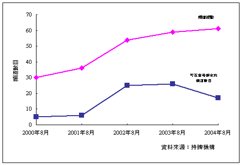 由 2000 年 8 月 至 2004 年 8 月 期 间 电 视 频 道 数 目 的 变 化 , 可 参 看 图 4 。
