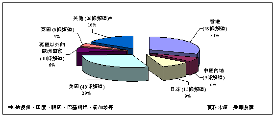 截 至 2004 年 8 月 底 , 香 港 本 地 收 费 电 视 节 目 服 务 共 提 供 163 条 频 道 , 其 中 31﹪ ( 49 条 频 道 ) 属 于 本 地 制 作 , 另 外 69﹪ ( 11 4 条 频 道 ) 则 是 购 自 香 港 以 外 地 方 , 主 要 是 美 国 ( 29﹪ 或 48 条 频 道 ) 、 日 本 ( 9﹪ 或 15 条 频 道 ) 、 中 国 內 地 ( 6﹪ 或 9 条 频 道 ) 及 欧 洲 国 家 ( 10﹪ 或 16 条 频 道 ) 。