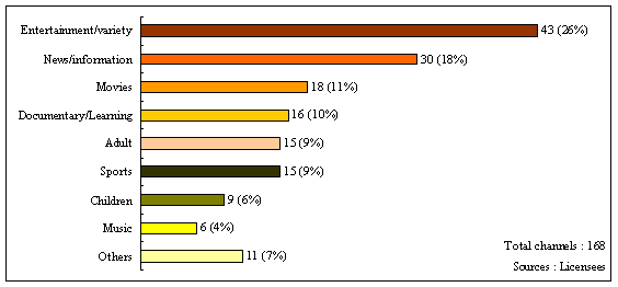 A wide variety of channels were offered on the domestic pay television programme services, including entertainment and variety channels (26%), news and information channels (18%), movie channels (11%) and documentaries/learning channels (about 10%). Figure 22 : Nature of Domestic Pay Television Channels