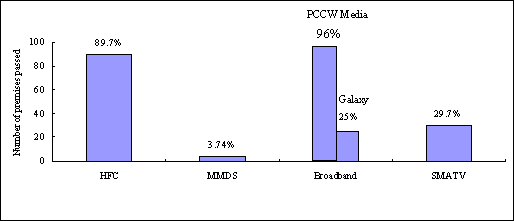 PCCW Media and Galaxy provide digital broadcasting service via broadband networks, covering 96% and 25% of households respectively.