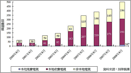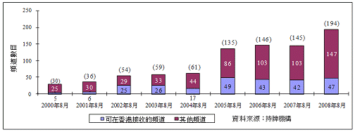 2.2 頻道數目 2.2.1 電視節目服務 截至2008年8月,21個本地免費、本地收費和非本地電視節目服務牌照持牌機構合共提供503條電視頻道2,其中356條頻道可在香港接收,分別較前一年增加19.8%和12.3%。圖3概述有關電視節目服務持牌機構所提供的頻道。 亞視和無綫各自以模擬制式經營一個中文台和一個英文台,分別是亞視本港台和亞視國際台,以及無綫翡翠台和無綫明珠台。除提供現有四條模擬制式頻道的同步數碼服務外,亞視提供五條標清電視頻道及一條高清電視頻道3,而無綫提供一條高清電視頻道及一條標清電視頻道4。 三個本地收費電視節目服務牌照持牌機構所提供的收費電視頻道總數,由前一年的271條增加至293條,增幅為8%。 另外,截至2008年8月,香港寬頻網絡有限公司(香港寬頻)亦提供79條收費電視頻道。不過,由於香港寬頻的服務是經互聯網提供,因此不受《廣播條例》(第562章) 5的發牌制度所規管。 非本地電視節目服務牌照持牌機構所提供的電視頻道數目,則由前一年的145條增加至194條。香港觀眾可接收其中47條。