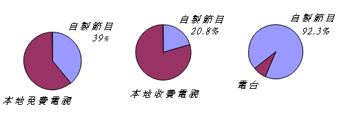 2.4 持牌機構的自製節目時數 在2007至08年度,亞視和無綫合計製作了13 344小時(39%)電視節目在模擬制式頻道播放,較2007年增加10%,並製作了27 563小時電視節目在數碼頻道播放8。在本地收費電視節目服務持牌機構可提供的293條頻道中,有61條(20.8%)是電視台自製的節目,比上年度增加13%。至於聲音廣播方面,除港台第6台轉播英國廣播公司的BBC World Service外,其餘12條電台頻道的節目都是由廣播機構自行製作。