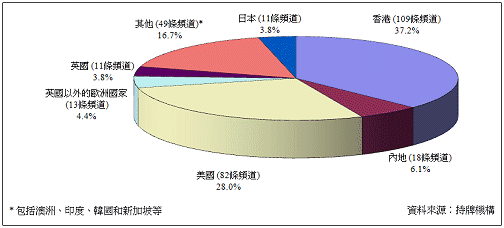 截至2008年8月底,香港本地收費電視節目服務共提供293條頻道,其中37.2%(109條頻道)屬於本地製作,另外62.8%(184條頻道)則是購自香港以外地方,主要是美國(28%或82條頻道)、內地(6.1%或18條頻道)、歐洲國家(4.4%或13條頻道)、日本(3.8%或11條頻道)及英國(3.8%或11條頻道)。