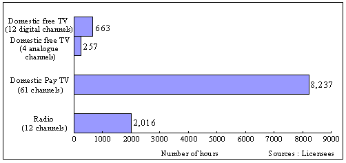 27 563 hours on the digital channels8. Of the 293 channels provided by the domestic pay television programme service licensees, 61 (20.8%) were station-produced, representing an increase of 13% over the previous year. As for sound broadcasting, with the exception of RTHK Radio 6 relaying BBC World Service, the other 12 radio channels were produced by the broadcasters.