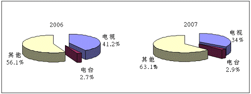在2007年,广播服务为香港经济带来64亿元21的收益,占本地生产总值约0.4%。广播服务的收益主要来自广告费和收看费。本地免费电视节目服务牌照持牌机构和声音广播牌照持牌机构的收入,主要来自出售节目之间的广告时段。另一方面,本地收费电视节目服务牌照持牌机构的收入,主要来自收看费,而出售广告时段则是其次要收入。 在2007年,广播服务大约聘用8 40022个员工,占香港总工作人口约0.23%。 5.1 广告收益 据CSM媒介研究有限公司估计,电视和电台的广告开支23,分别占2007年传媒广告预计开支总额(577亿元)的34%(196亿元)和2.9%(17亿元)。 无线在2007年赚得的实际广告收益约为24亿元24。其它持牌机构的实际广告收益未有公布。 图14展示各媒体在2006及2007年广告开支所占比例。图15则展示2000至2007年间电视和电台预计广告开支的变化。