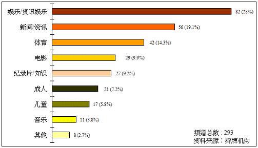 本地收费电视节目服务提供多种不同频道,包括娱乐及信息娱乐频道(28%)、新闻及信息频道(19.1%)、体育频道(14.3%)、电影频道(9.9%)和纪录片/知识频道(9.2%)。