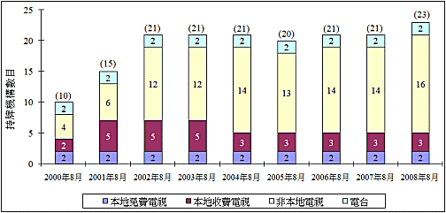 2.1 持牌机构数目 2.1.1 电视节目服务 截至2008年8月,香港共有21个本地免费、本地收费和非本地电视节目服务牌照持牌机构。 本地免费电视节目服务牌照持牌机构的数目仍然是2个,即亚视和无线,而本地收费电视节目服务牌照持牌机构的数目则仍然是3个,分别是香港有线电视有限公司(有线电视)、电讯盈科媒体有限公司(电盈媒体)和无线收费电视有限公司(无线收费电视)。 非本地电视节目服务牌照持牌机构的数目上升2个至16个。而其他须领牌电视节目服务牌照持牌机构的数目上升1个至25个,为香港83间酒店提供电视节目服务。 2.1.2 声音广播服务 截至2008年8月,声音广播牌照持牌机构的数目仍然是2个,即香港商业广播有限公司(商业电台)和新城广播有限公司(新城电台)。在2008年,政府在考虑广管局的建议后,向雄涛广播有限公司(雄涛广播)批出声音广播牌照,根据牌照,雄涛广播须在获批发牌照起计两年內展开广播服务。 作为政府部门的香港电台(港台),是香港的公营广播机构。除提供电台服务外,港台亦制作电视节目,供本地免费和本地收费电视节目服务牌照持牌机构播放。