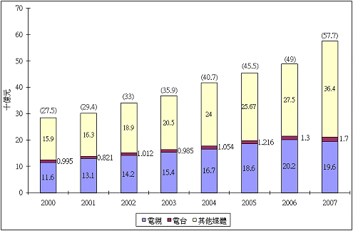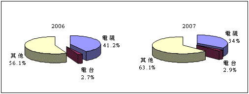 在2007年,广播服务为香港经济带来64亿元21的收益,占本地生产总值约0.4%。广播服务的收益主要来自广告费和收看费。本地免费电视节目服务牌照持牌机构和声音广播牌照持牌机构的收入,主要来自出售节目之间的广告时段。另一方面,本地收费电视节目服务牌照持牌机构的收入,主要来自收看费,而出售广告时段则是其次要收入。 在2007年,广播服务大约聘用8 40022个员工,占香港总工作人口约0.23%。 5.1 广告收益 据CSM媒介研究有限公司估计,电视和电台的广告开支23,分别占2007年传媒广告预计开支总额(577亿元)的34%(196亿元)和2.9%(17亿元)。 无线在2007年赚得的实际广告收益约为24亿元24。其他持牌机构的实际广告收益未有公布。 图14展示各媒体在2006及2007年广告开支所占比例。图15则展示2000至2007年间电视和电台预计广告开支的变化。