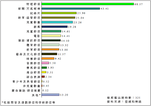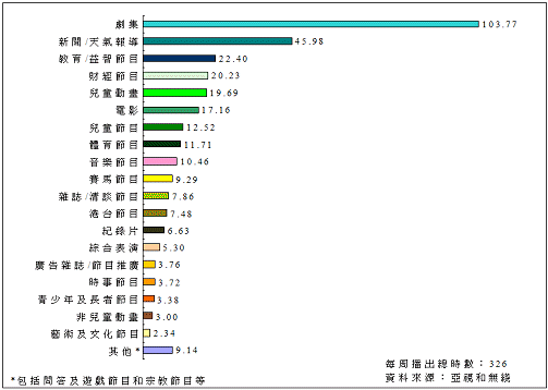 8.1 本地免费电视节目服务 年內,中文台的黃金时段主要仍是播放剧集。大致来说,亚视的剧集主要来自內地和台湾,而无线的剧集则大部分是內部制作。不过,两台亦有播放一些韩国及日本剧集。除剧集外,电视台亦推出多个自行制作的问答游戏、烹饪节目和旅游记录片,大受观众欢迎。