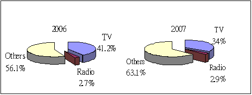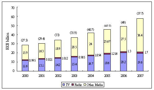 The licensed broadcasting services contributed an estimated $6.4 billion21 to the Hong Kong economy, which represented around 0.4% of gross domestic product ("GDP") in 2007. There are two main sources of revenues for the provision of broadcasting services, viz. advertising and subscription. The incomes of domestic free television programme service licensees and sound broadcasting licensees mainly come from sales of advertising spots within programme breaks. The domestic pay television programme service licensees, on the other hand, derive their incomes mainly from subscription fees while sales of advertising spots remain secondary incomes. In 2007, the broadcasting services engaged an estimated 8 40022 employed persons, representing about 0.23% of total workforce in Hong Kong. 5.1 Advertising Revenue According to the estimate of CSM Media Research, the advertising expenditures on television and radio23 accounted for 34% ($19.6 billion) and 2.9% ($1.7 billion) respectively of the estimated total $57.7 billion advertising expenditure in the media in 2007. In 2007, the actual advertising revenue of TVB was around $2.4 billion24. The actual advertising revenues for the other licensees were not publicly available. The share of advertising expenditure in different media in 2006 and 2007 is shown in Figure 14. Changes in the estimated advertising expenditure from 2000 to 2007 on television and radio are shown in Figure 15.