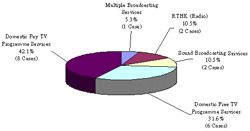 The number of complaint cases referred to the Authority, i.e. 19 cases (453 complaints), showed a decrease of approximately 32.1% as compared with 28 cases (130 complaints) in the previous reporting period. 8 cases (42.1%) referred to the Authority were about domestic pay television programme services, 6 cases (31.6%) were about domestic free television programme services, 2 cases (10.5%) were about sound broadcasting services, 2 cases (10.5%) were about RTHK's radio service, and the remaining one case (5.3%) was directed at more than one broadcasting services. Details of the distribution of the complaint cases dealt with by the Authority among the different broadcasting services are at Figure 34.