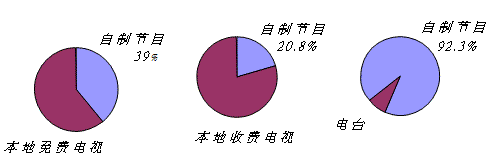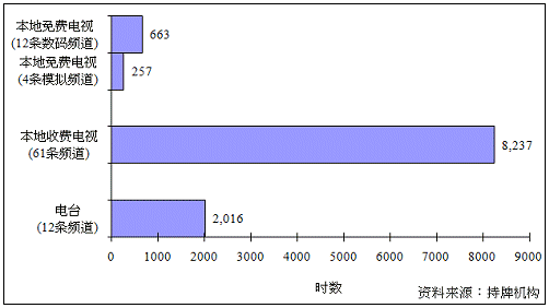 2.4 持牌机构的自制节目时数 在2007至08年度,亚视和无线合计制作了13 344小时(39%)电视节目在仿真制式频道播放,较2007年增加10%,并制作了27 563小时电视节目在数码频道播放8。在本地收费电视节目服务持牌机构可提供的293条频道中,有61条(20.8%)是电视台自制的节目,比上年度增加13%。至于声音广播方面,除港台第6台转播英国广播公司的BBC World Service外,其余12条电台频道的节目都是由广播机构自行制作。
