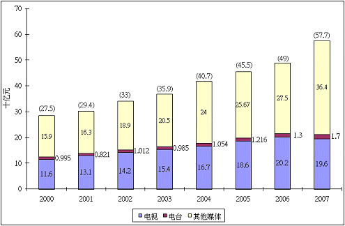 在2007年,广播服务为香港经济带来64亿元21的收益,占本地生产总值约0.4%。广播服务的收益主要来自广告费和收看费。本地免费电视节目服务牌照持牌机构和声音广播牌照持牌机构的收入,主要来自出售节目之间的广告时段。另一方面,本地收费电视节目服务牌照持牌机构的收入,主要来自收看费,而出售广告时段则是其次要收入。 在2007年,广播服务大约聘用8 40022个员工,占香港总工作人口约0.23%。 5.1 广告收益 据CSM媒介研究有限公司估计,电视和电台的广告开支23,分别占2007年传媒广告预计开支总额(577亿元)的34%(196亿元)和2.9%(17亿元)。 无线在2007年赚得的实际广告收益约为24亿元24。其它持牌机构的实际广告收益未有公布。 图14展示各媒体在2006及2007年广告开支所占比例。图15则展示2000至2007年间电视和电台预计广告开支的变化。