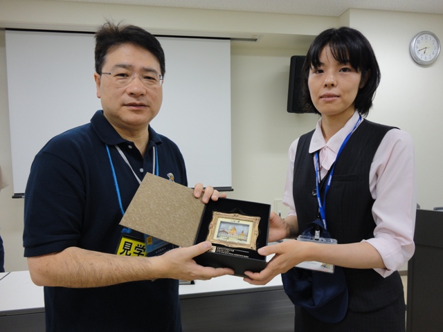 访问团团长李华明议员向札幌中央批发市场代表致送纪念品。