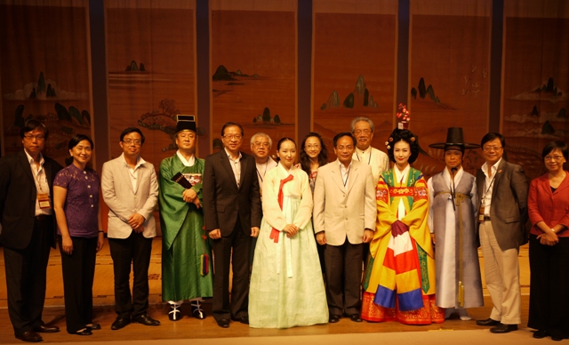 Group photo of the delegation and artists performing traditional music and dance at the National Centre for Korean Traditional Performing Arts.