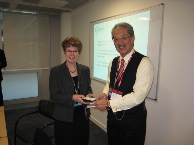 代表團團長黃宜弘議員向社區及地方政府署副總監(地區審計前景)朱雅妮女士(Julie Carney)致送紀念品。
