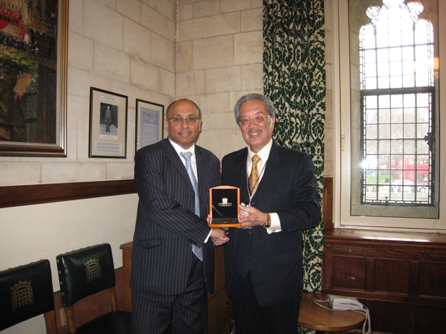 代表团团长黃宜弘议员向英国国会跨政党国会中国事务小组主席韩麦克议员(Mark Hendrick)致送纪念品。
