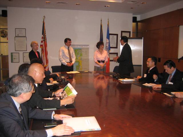 立法会海滨规划事宜小组委员会访问团与炮台公园城管理局(公园城管理局)的代表会晤,讨论纽约炮台公园城(公园城)的管理事宜,以便能就采用公私营机构合作模式发展公园城作更深入的了解。在远处站立者(由左至右):公园城管理局特别项目总监Sidney DRUCKMAN女士、公园城管理局高级副总裁(财务及库务)Robert M Serpico先生、公园城管理局社区关系/传媒及赞助活动副总裁Leticia REMAURO女士及访问团团长刘秀成议员。