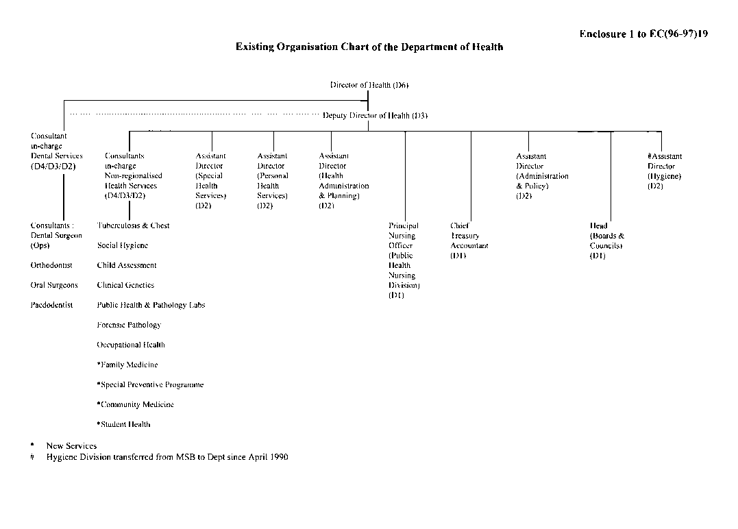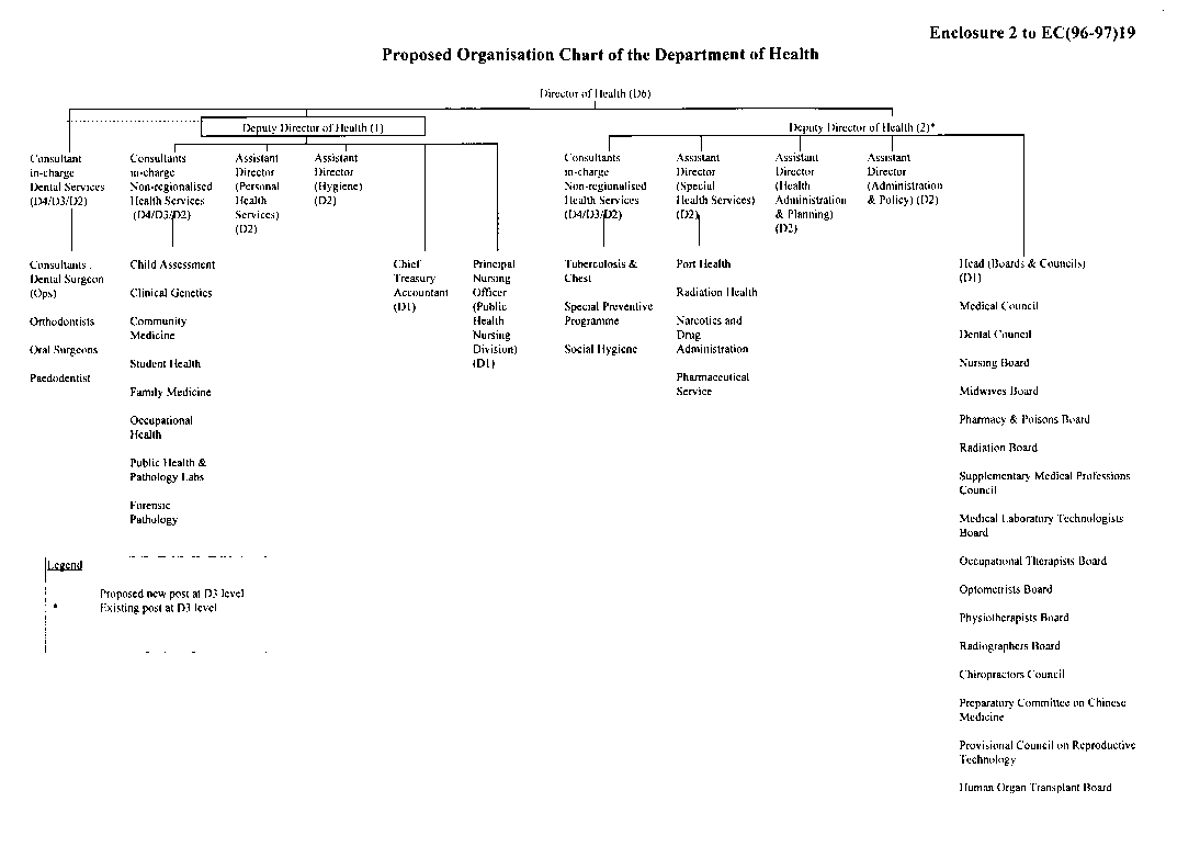 10. The existing and proposed organisation charts of the DH are at Enclosures 1 and 2. The duty list of the existing DD of Health is at Enclosure 3 and the proposed job descriptions for the two DD of Health posts are at Enclosures 4 and 5.
