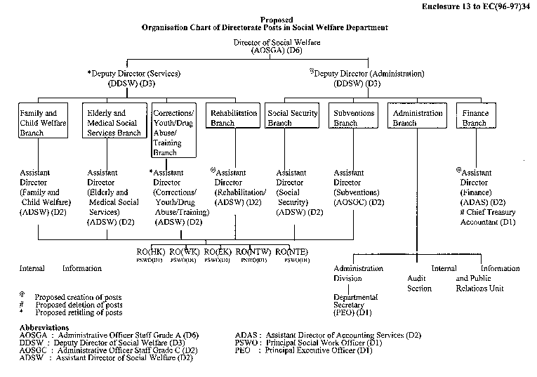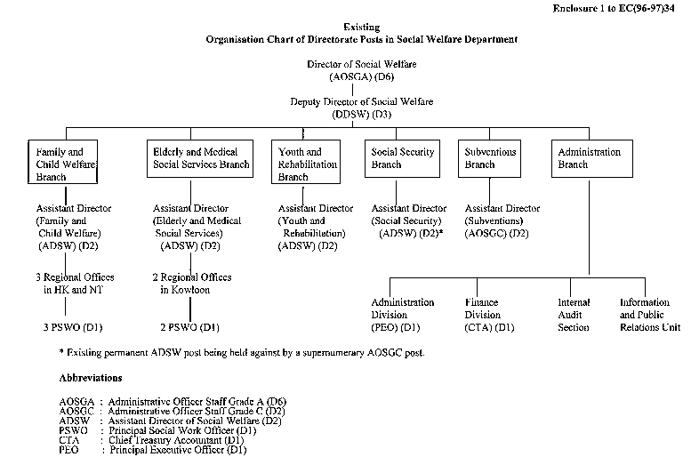 24. With the creation of the proposed posts of a DDSW (D3), an Assistant Director of Social Welfare (D2) and the upgrading of CTA to Assistant Director of Accounting Services (D2), the revised organisation chart of the directorate structure of the department is at Enclosure 13.