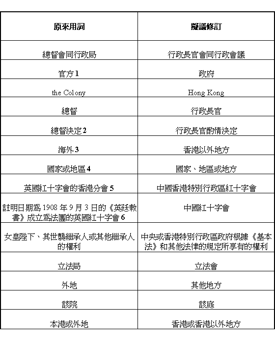 書》。由於香港紅十字會由1997年7月1日起改變隸屬關係,因而作出相應修改,刪除此項提