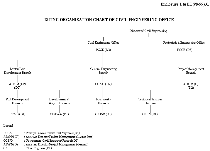 17. The GEB consisting of the PW Division and the D&A Division has been in existence since 1964. The TS Division was formed in 1995. The LPDB was created in 1993 (it was originally named as the Port and Airport Development Strategy Branch and was retitled in 1995). The PMB was established in May 1995 to manage the project delivery process from inception through to completion, in order to ensure high-expenditure projects are delivered on time and within budget.