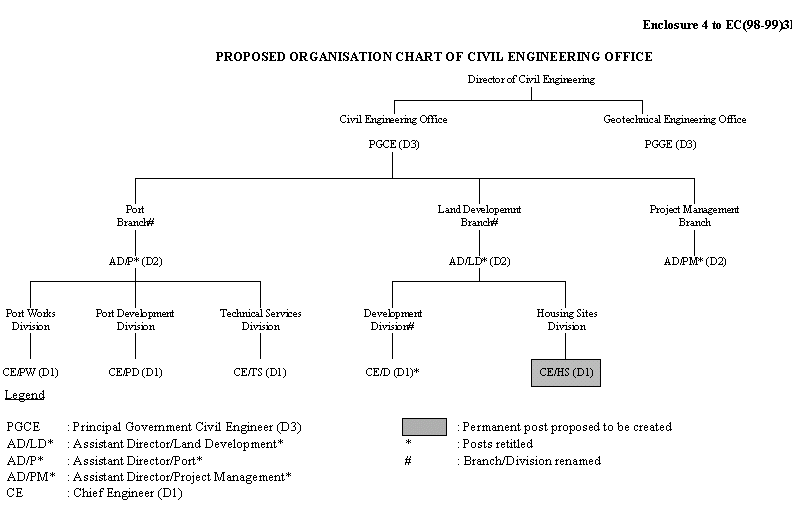 - to establish a new Housing Sites Division, headed by a new permanent post of Chief Engineer/ Housing Sites (CE/HS), in the General Engineering Branch;