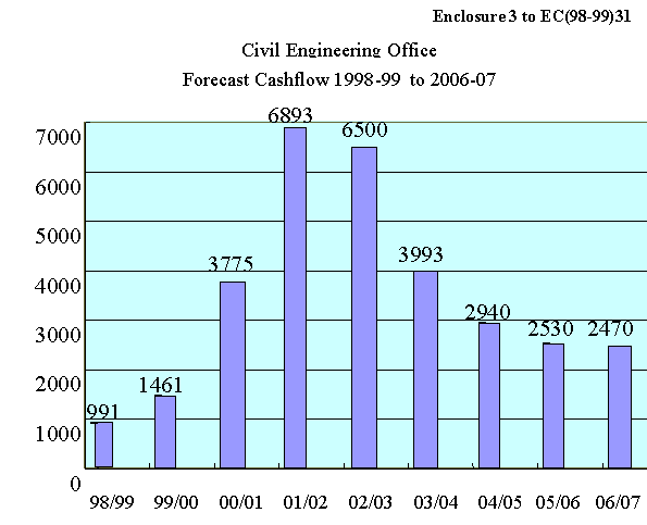 8. Given the significant increase in workload described above, all four CEs in the CEO are fully loaded and they do not have spare capacity to take on the additional responsibility for the site formation projects. As considerable resources in the CEO are deployed on projects in the planning and design stages, adequate directorate level input is essential to ensure proper management of the projects during these stages. We estimate that, if all projects in various stages of development proceed as scheduled, the total expenditure on projects handled by the CEO in the next eight years will be about $35 billion. As the forecast cash flow chart at