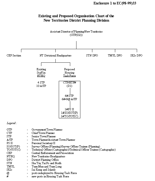 | 7. The existing and proposed organisation chart of New Territories Headquarters of PlanD is at Enclosure 1. The job description of the proposed CTP post is at Enclosure 2. | Encl. 1