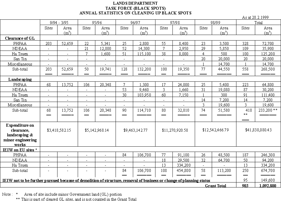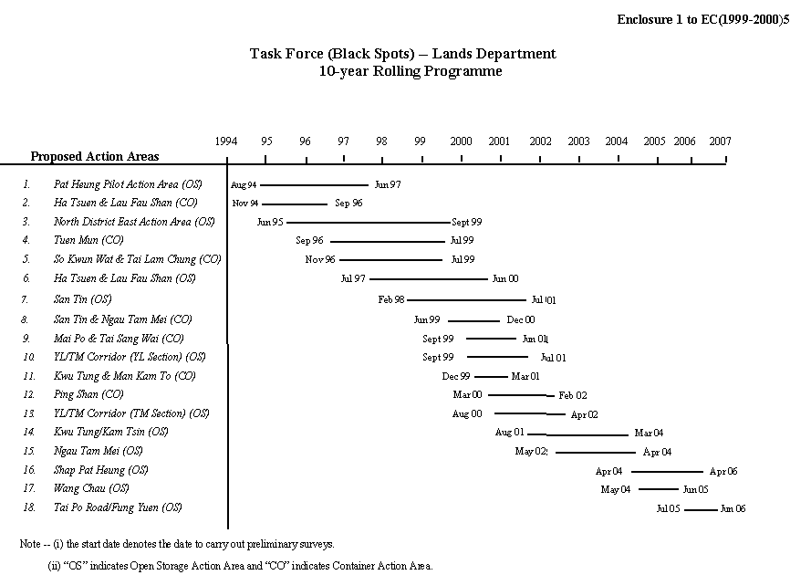 | 3. On 10 June 1994, Members approved the creation of one supernumerary post of GLA (D2) to head the Task Force (Black Spots) (TFB) in Lands Department (Lands D) [vide EC(94-95)14]. The supernumerary GLA post was approved initially for two years, and approval was subsequently given for its retention for a further three years from 10 June 1996 [vide EC(96-97)13]. The TFB, a multi-disciplinary team comprising professional and executive officers, was set up in 1994 to clean up environmental black spots in the rural areas (e.g. container depots, open storage of scrap metal or machinery) categorised as "existing uses" (EU) 1under the Town Planning Ordinance. Operating under the direction of the Special Committee on the Cleaning Up of Black Spots in the New Territories (the Special Committee)2 , the TFB formulated a 10-year rolling programme in 1996 to clean up these black spots (see Enclosure 1). | Encl. 1
