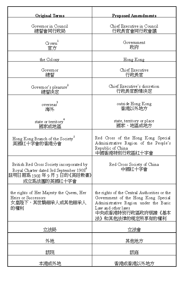 5 & 6 These references are adapted to reflect the change of affiliation of the Hong Kong Red Cross from the British Red Cross Society to the Red Cross Society of China with effect from 1 July 1997.