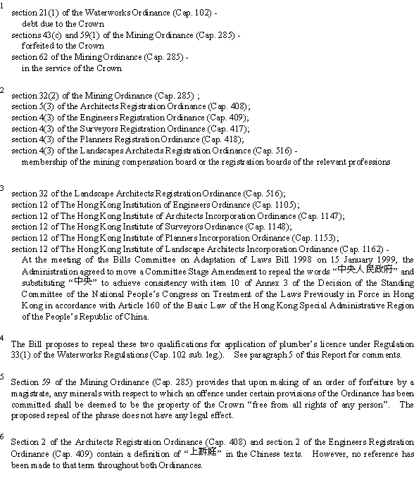 10. Subject to the reply of the Administration on the question of repealed qualifications mentioned in paragraph 5 above, it is recommended that resumption of Second Reading debate of this Bill should take place after the Bills Committee on the Adaptation of Laws Bill 1998 has made its report so that any general points on the adaptation of laws exercise which may be recommended by that Bills Committee could be considered in the context of this Bill.