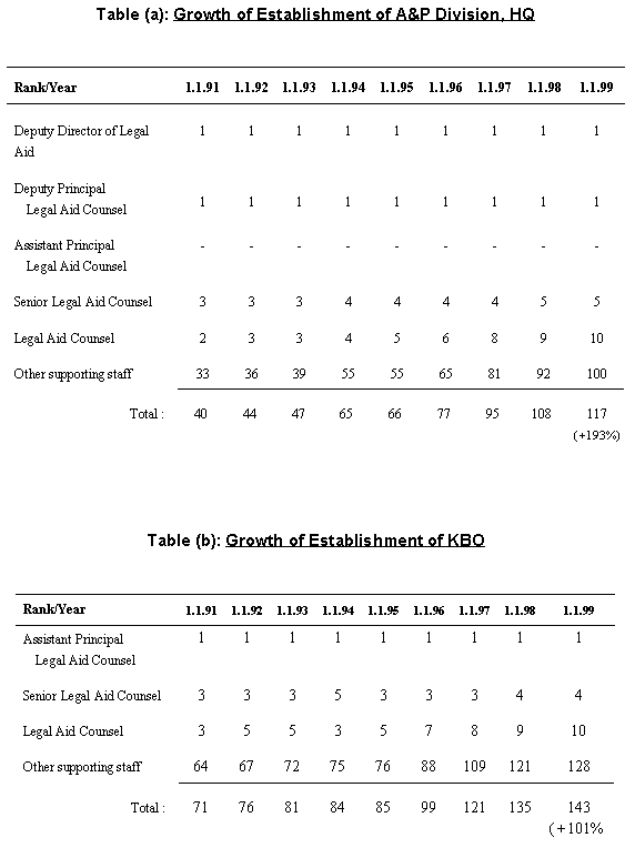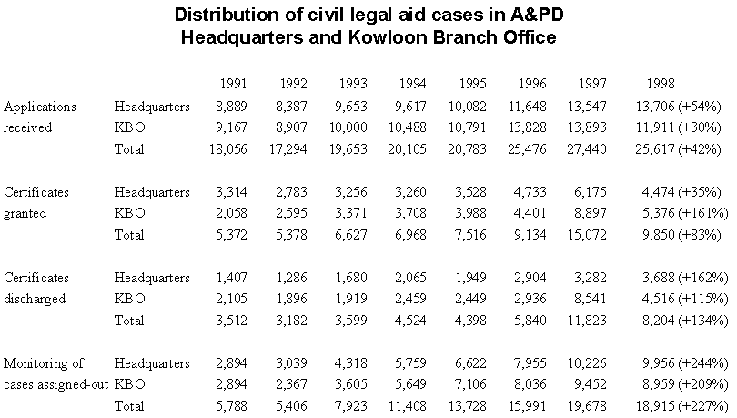 3. The workload of KBO has continued to increase in recent years. Enclosure 1 illustrates the increases and the distribution of workload at Headquarters and KBO between 1991 and 1998. Enclosure 2 shows the corresponding growth of staff at A&PD in the same period. In addition, the social and political developments in Hong Kong created new demands on the legal aid service. Public aspiration called for a more open and efficient service. Increases in the number of applications in relation to judicial review also put a heavy strain on the three directorate staff of the A&PD, who not only are responsible for the operation of the Division but are also required to assist in the overall management of the department (including dealing with complaints and media enquiries and the formulation of legal aid policies).