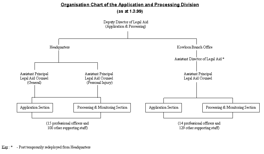 2. The A&PD is responsible for processing legal aid applications and monitoring of assigned out cases. The directorate structure of the A&PD which was approved in September 1989 comprises one Deputy Director of Legal Aid (DDLA) and one Assistant Director of Legal Aid (ADLA), both at the Headquarters Office, and one APLAC at the Kowloon Branch Office (KBO). Because of increases in workload and the need to strengthen the operation and management of KBO, the ADLA was deployed to KBO in 1990 with the APLAC in KBO deployed to Headquarters.
