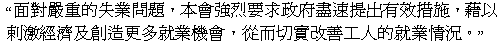 20. At the suggestion of Miss CHAN Yuen-han, members present passed the following motion to urge the Administration to create jobs and tackle unemployment -