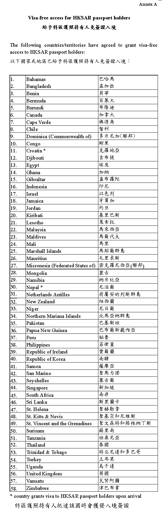 4. Thanks to the above mentioned efforts, visa-free access to 58 countries/territories has been secured for HKSAR passport holders. Details are at Annex A. Australia has also decided to extend the Electronic Travel Authority (ETA) system1 to Hong Kong with effect from 1 July this year.