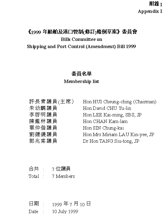 This paper reports on the deliberations of the Bills Committee on Shipping and Port Control (Amendment) Bill 1999.